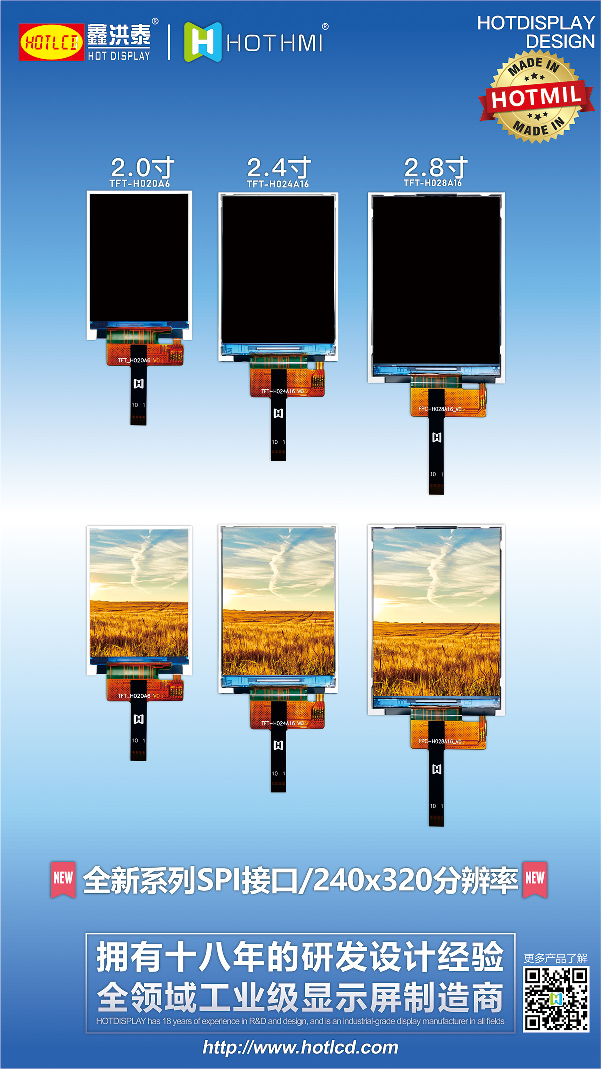 HOTLCD創(chuàng)立于2004年,位于全球電子產業(yè)鏈配套最快最全的粵港澳大灣區(qū),是一家專業(yè)從事新一代信息產業(yè)之LCD液晶顯示模組、TFT顯示屏產品的研發(fā)、生產、銷售和服務的深圳市高新技術企業(yè)。